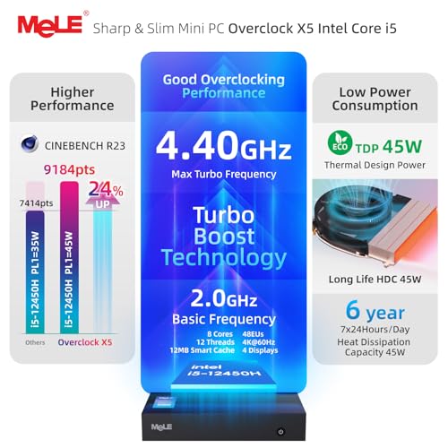 Sumérgete en la potencia del Mini PC equipado con un procesador de última generación Alder Lake Core i5 12450H, con 8 núcleos y 12 hilos capaces de alcanzar una frecuencia turbo de 4.4GHz. Maximiza tu productividad y rendimiento con su capacidad de overclocking y ajuste de PL1 de hasta 45W. Todo esto en un diseño compacto y silencioso gracias al disipador pasivo de grafeno, ideal para operaciones 24/7.