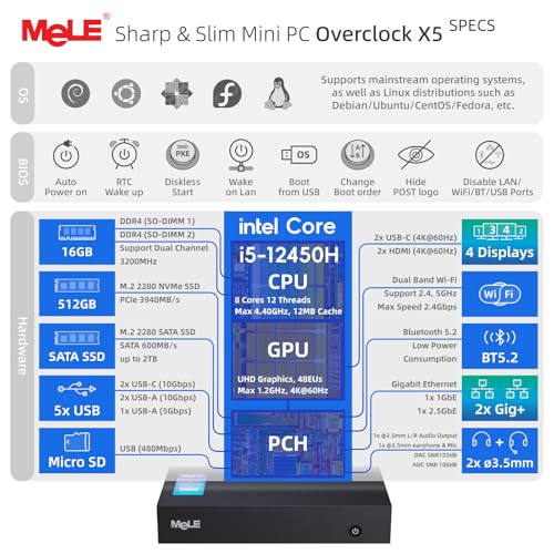 Disfruta de 16GB de RAM DDR4 ampliables a 64GB y un almacenamiento NVMe PCIe 4.0 de 512GB, ampliable hasta 2TB. La velocidad de transferencia es impresionante con ethernet 2.5G, WiFi 6E y Bluetooth 5.2. Perfecto para gaming, streaming y aplicaciones comerciales. Con soporte VESA, puerto HDMI 2.0, USB-C 3.2, y más, este Mini PC es tu aliado ideal en cualquier entorno.