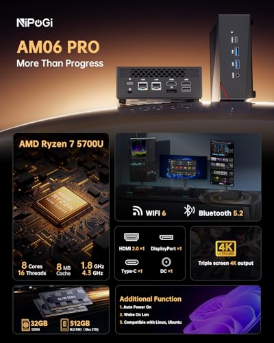 Por Qué Elegir NiPoGiNiPoGi te invita a disfrutar y equilibrar trabajo y descanso. La AM06 Pro incluye 1 mini PC 5700U, adaptador de corriente, soporte VESA, manual de usuario, cable HDMI y un año de servicio posventa y atención al cliente profesional 24/7. ¡No te lo pierdas!