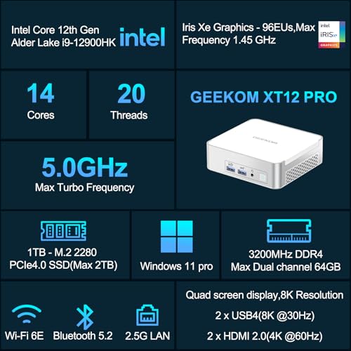 Rendimiento de Primera Clase - Descubre el Mini PC GEEKOM XT12 Pro, impulsado por el procesador Intel Core i9-12900HK de 12.ª generación. Con sus 14 núcleos, 20 hilos y una frecuencia de hasta 5 GHz, está diseñado para manejar las tareas más exigentes como servidores domésticos, aplicaciones educativas y más.