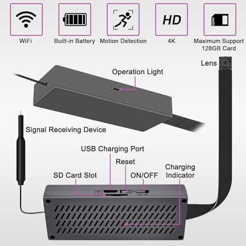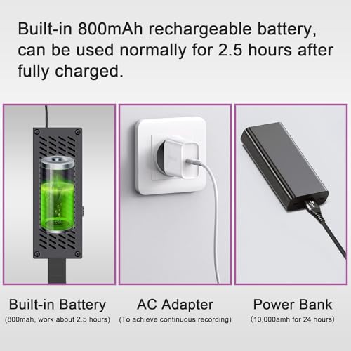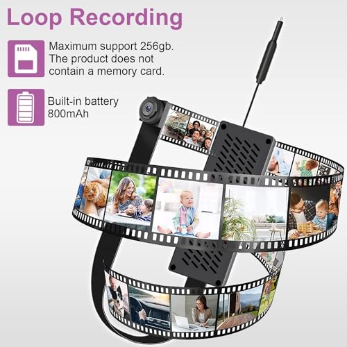 Graba videos en una tarjeta SD sin red: Con una batería integrada de 800 mAh, esta mini cámara puede funcionar durante 2.5 horas. Simplemente inserta una tarjeta (no incluida) y enciende la cámara. La grabación continuará automáticamente en la tarjeta SD.