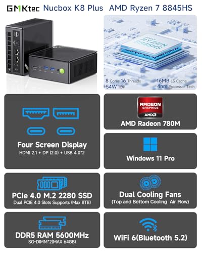 El mini PC K8 Plus no solo destaca por su potencia, sino también por su conectividad avanzada. Disfruta de conexiones rápidas y estables con los puertos Ethernet duales Intel i226V a 2,5 Gbps, WiFi 6 y BT 5.2. Además, la potente GPU AMD Radeon 780M te permitirá disfrutar de los juegos más exigentes con ajustes gráficos sorprendentes.